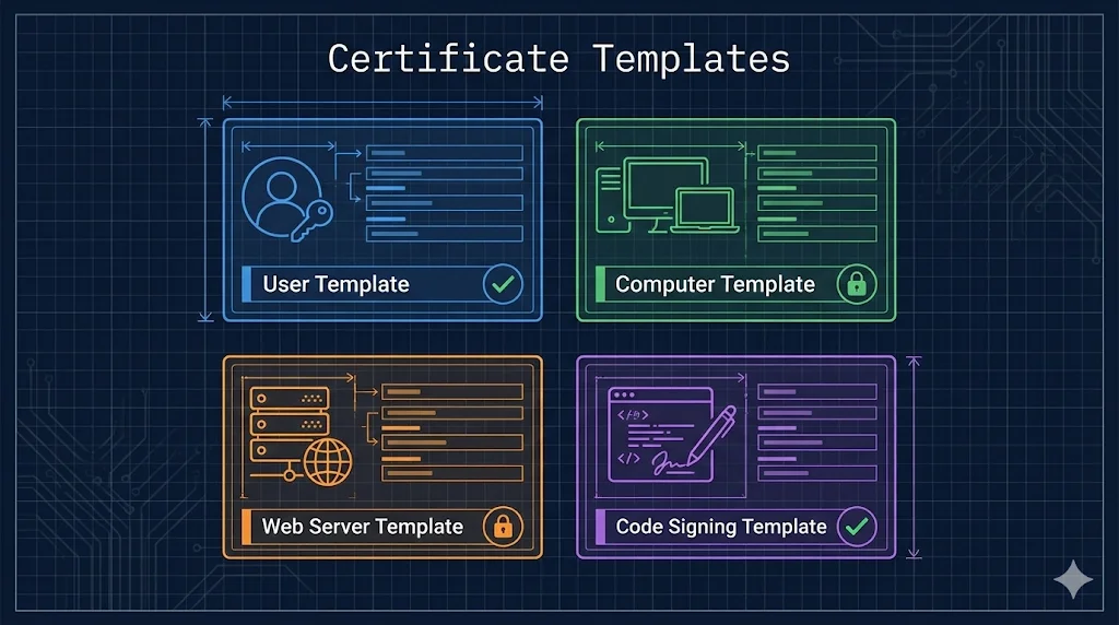 Certificate Templates are blueprints that define what properties a certificate will have, who can request it, and how it can be used. Think of them as pre-configured recipes - instead of manually specifying every certificate field, you select a template and the CA fills in the details.