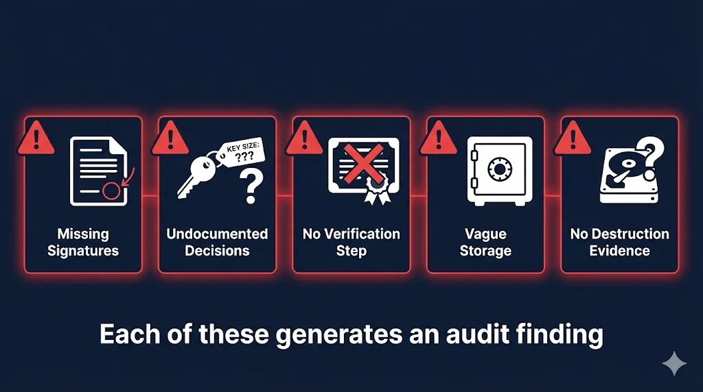 No destruction evidence. If you used a temporary workstation or scratch media during the ceremony, how was it wiped? "We wiped the drive" is insufficient. "Drive serial number [X] wiped using [method], confirmed by [witness name]" is what closes the loop.