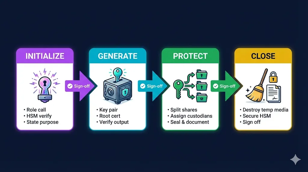 A well-structured ceremony script follows a predictable flow: initialize, generate, verify, back up, and shut down. Each phase has specific documentation requirements.