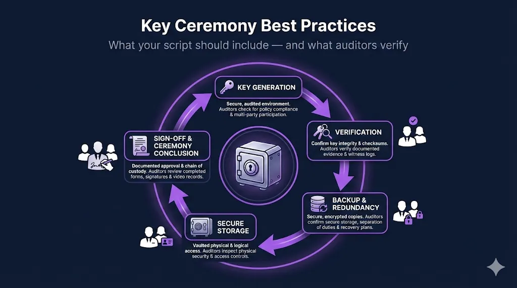 Here's what your key ceremony script needs to include — based on what actually happens in production and what auditors actually look for.