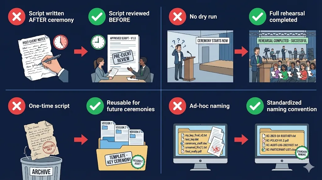 Not rehearsing. A dry run catches problems that paper reviews miss. Your HSM commands might have typos. Your quorum might not all be available on the scheduled date. The air-gapped workstation might not have the right software version. A one-hour rehearsal can save you from a failed four-hour ceremony with six people in the room.