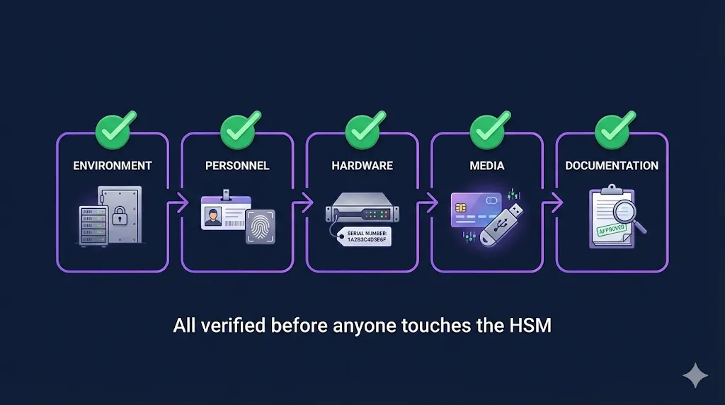 Before anyone touches the HSM, a series of verifications need to be completed and documented. Skipping this phase is one of the most common mistakes — teams jump straight to key generation and realize mid-ceremony that they forgot to check something critical.