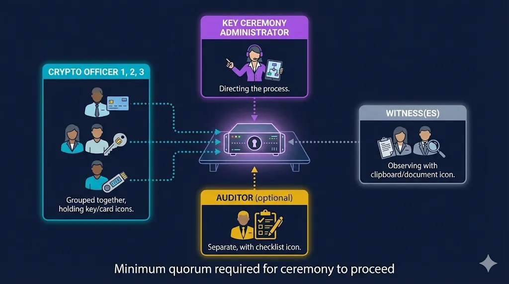 The people in the room typically include a Key Ceremony Administrator (who runs the script), Crypto Officers (who hold key shares or smart cards), Witnesses (who observe and attest), and optionally an Auditor (who validates the process in real time).
