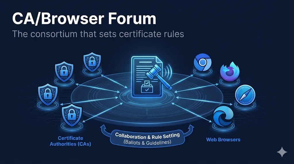 The CA/Browser Forum is a voluntary consortium where Certificate Authorities (the companies that issue certificates) and browser vendors (Chrome, Firefox, Safari, Edge) collaborate to create the rules governing publicly-trusted certificates.