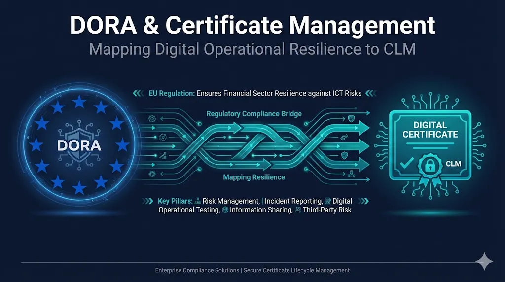 DORA (Digital Operational Resilience Act) is an EU regulation requiring financial entities to demonstrate operational resilience against ICT risks. Certificates—the digital IDs that secure logins, APIs, and data in transit—are critical ICT assets. Certificate lifecycle management (how certificates are issued, renewed, revoked, and tracked across your estate) is now directly relevant to DORA compliance.
