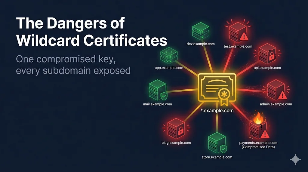 When you use a wildcard certificate, every service on every subdomain shares the same private key. If an attacker compromises any one of these services, they can impersonate all of them.
